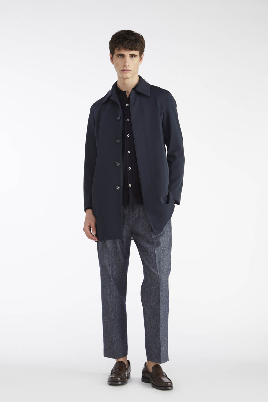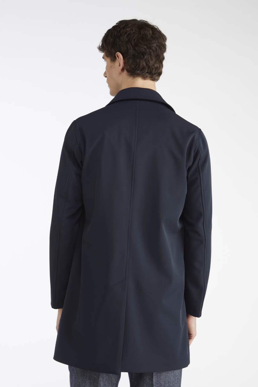 Abrigo masculino de corte recto en color azul marino, confeccionado en tejido técnico impermeable. Presenta un diseño minimalista de inspiración clásica, con cierre de botones grandes y cuello camisero. Un básico refinado para los días de frío, ideal para looks urbanos y formales.