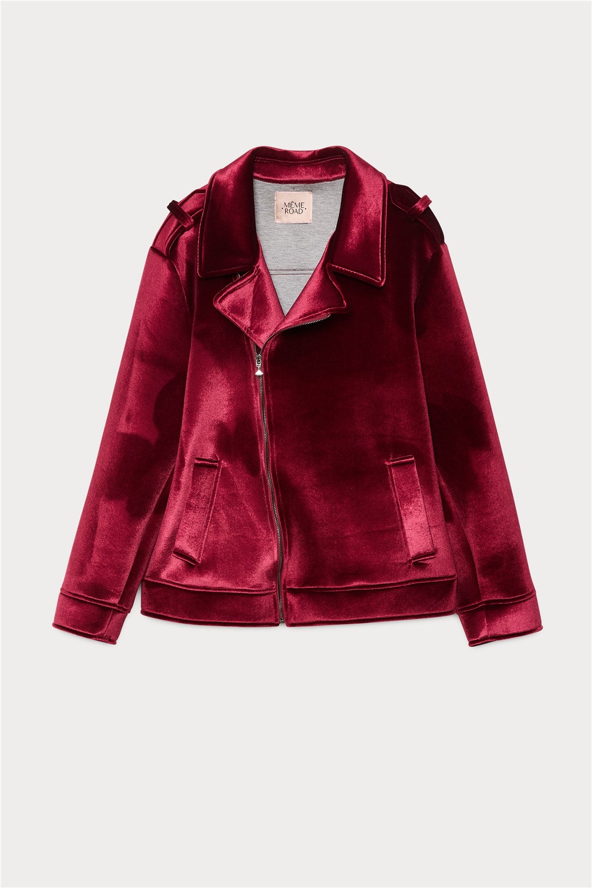 Chaqueta tipo biker confeccionada en neopreno con acabado aterciopelado, de un intenso tono burdeos. Su tejido suave y estructurado aporta un equilibrio perfecto entre comodidad y elegancia. Con cierre delantero de cremallera y bolsillos laterales.