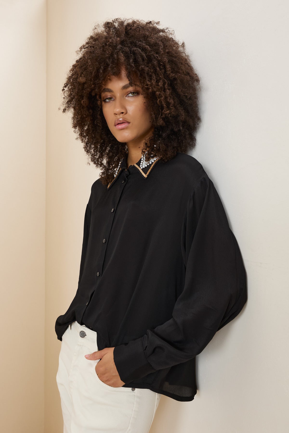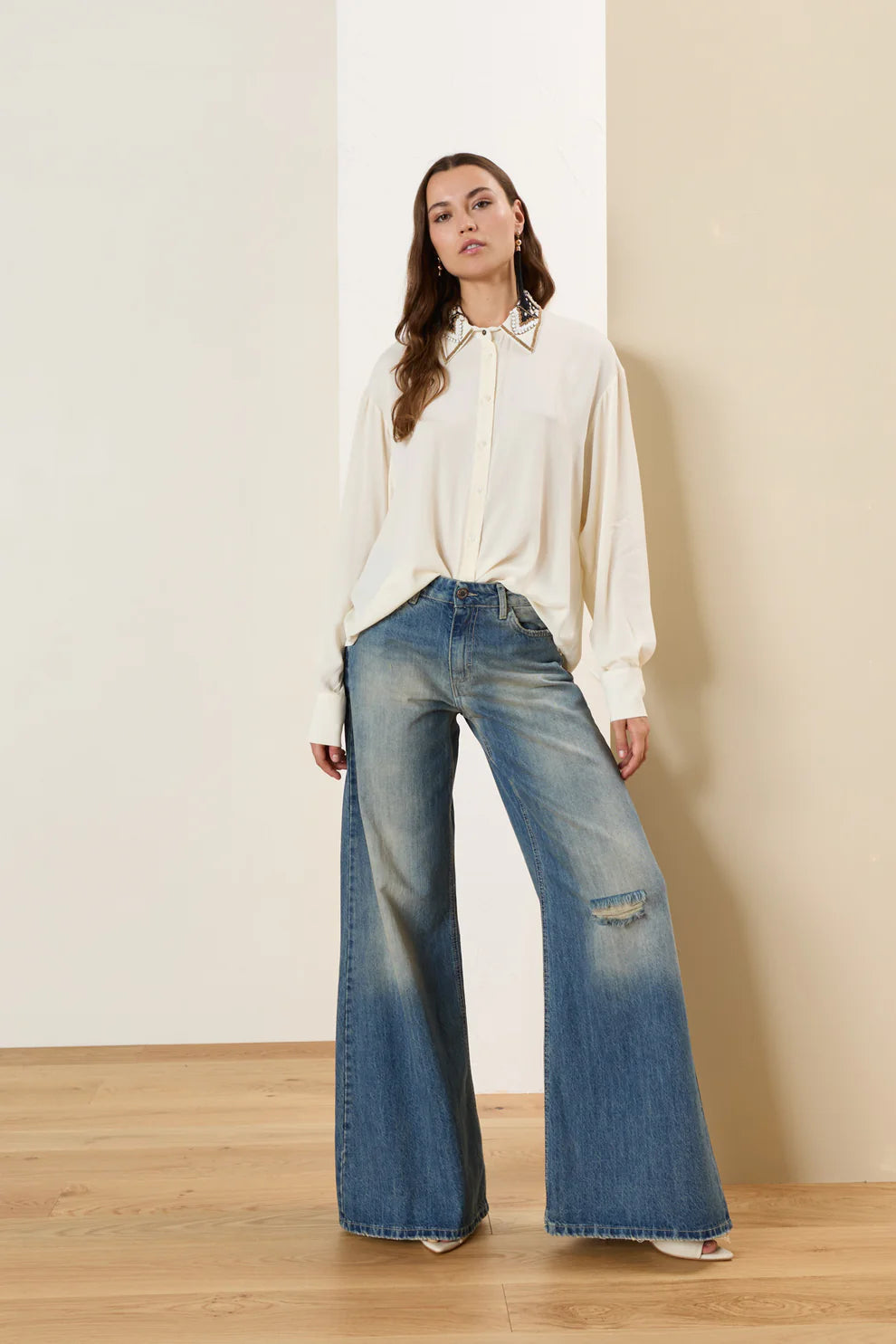 Camisa fluida en tono crudo con detalles bordados en el cuello de inspiración étnica. Perfecta para aportar un aire boho y sofisticado a conjuntos informales.