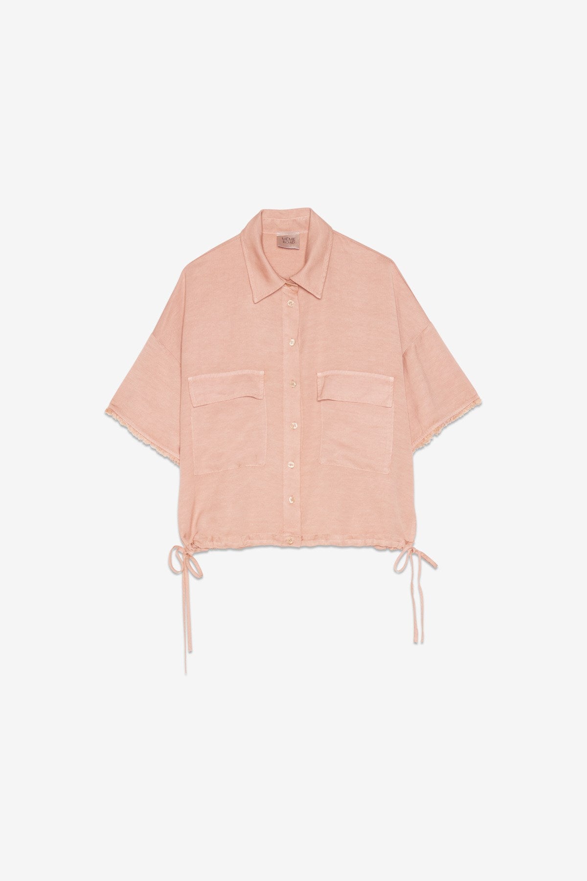 Camisa de manga corta y corte relajado, confeccionada en tejido ligero de tacto suave. Presenta cuello clásico, cierre frontal con botones y dos bolsillos aplicados en el pecho. El bajo incorpora cordones ajustables en los laterales, que permiten regular el volumen y adaptar la silueta.