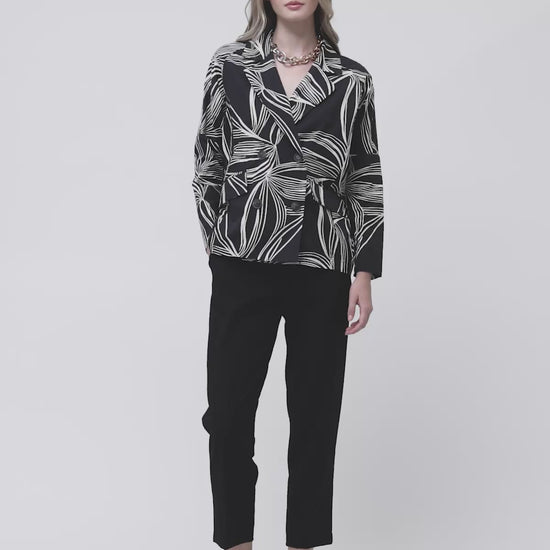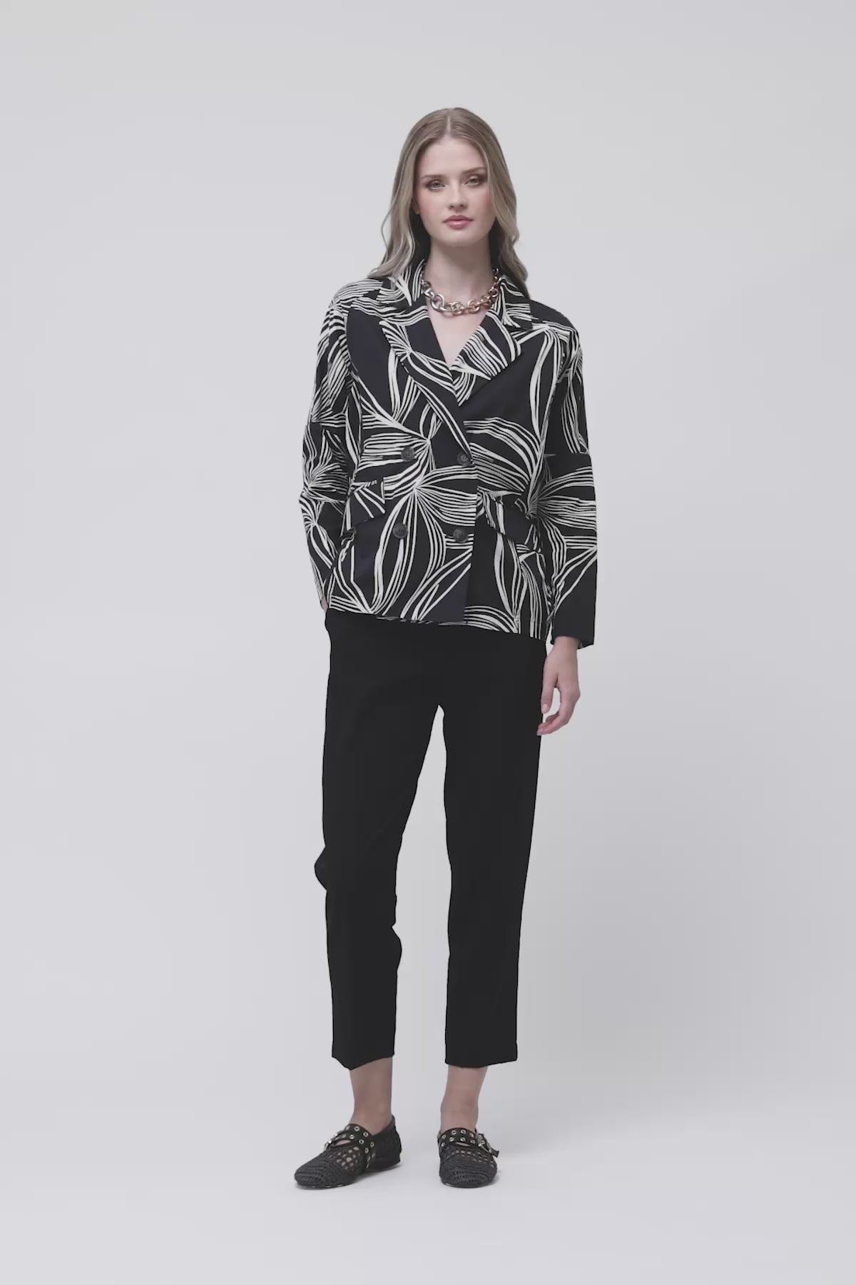 Blazer de doble botonadura con espectacular estampado de hojas tropicales en blanco sobre fondo negro. Cuello solapa amplio, botones decorativos y corte oversize relajado. Una pieza statement para crear conjuntos coordinados o combinada con vaqueros para un look urbano sofisticado.