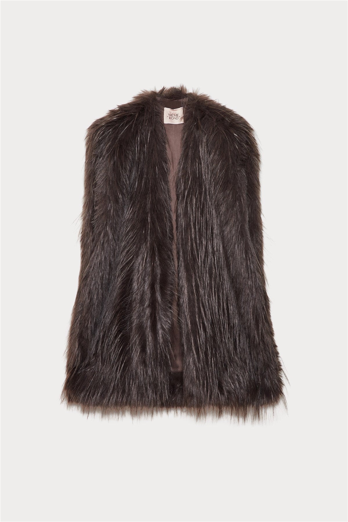 Chaleco largo de pelo sintético con textura densa y tacto suave. Sin cierre, con interior forrado para mayor confort. Su tono marrón oscuro aporta profundidad y calidez a cualquier conjunto, ideal para superponer sobre camisas o jerséis.
