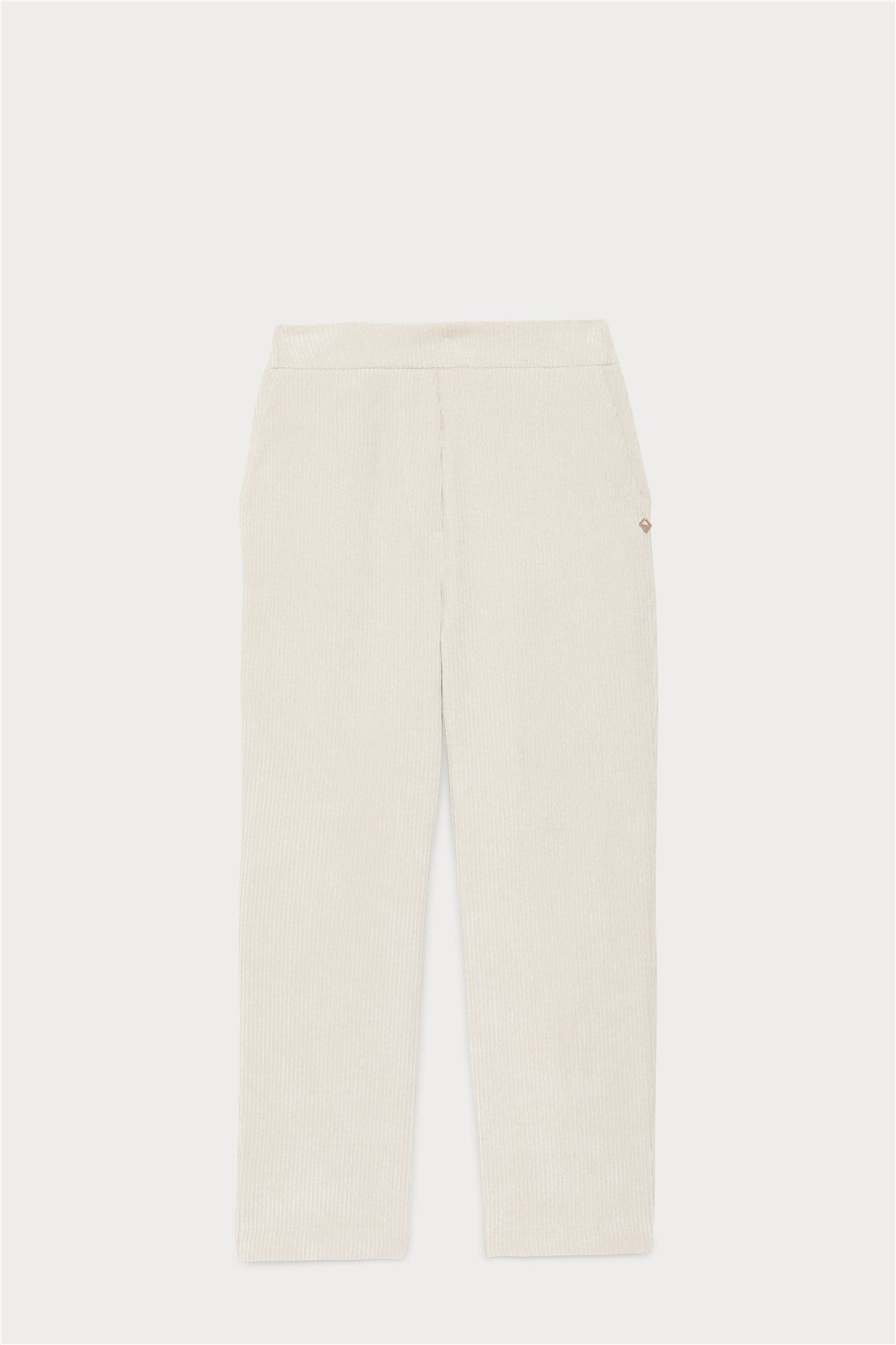 Pantalón de pana color crudo, confeccionado en algodón con corte recto y cintura elástica. Su diseño minimalista y su textura suave lo convierten en una prenda cómoda y elegante para el día a día.