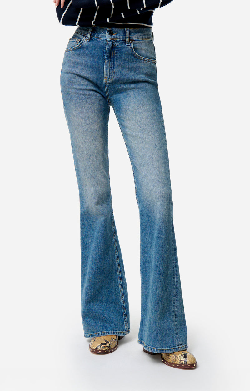 Vaqueros de talle alto en denim azul medio, con pernera ligeramente acampanada. Su tejido firme realza la figura y ofrece una silueta moderna inspirada en los años 70.