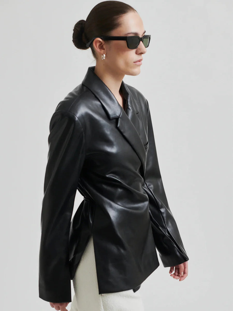 El Seema Asymmetric Blazer de Second Female reinventa la americana clásica con un aire contemporáneo y femenino. Confeccionado en piel sintética de acabado liso y brillante, presenta una solapa de muesca y un cinturón que se ata en un lateral, creando una silueta asimétrica y favorecedora. Incluye un bolsillo en el pecho y mangas largas, con un fit regular que se ajusta más en un costado para marcar la cintura.