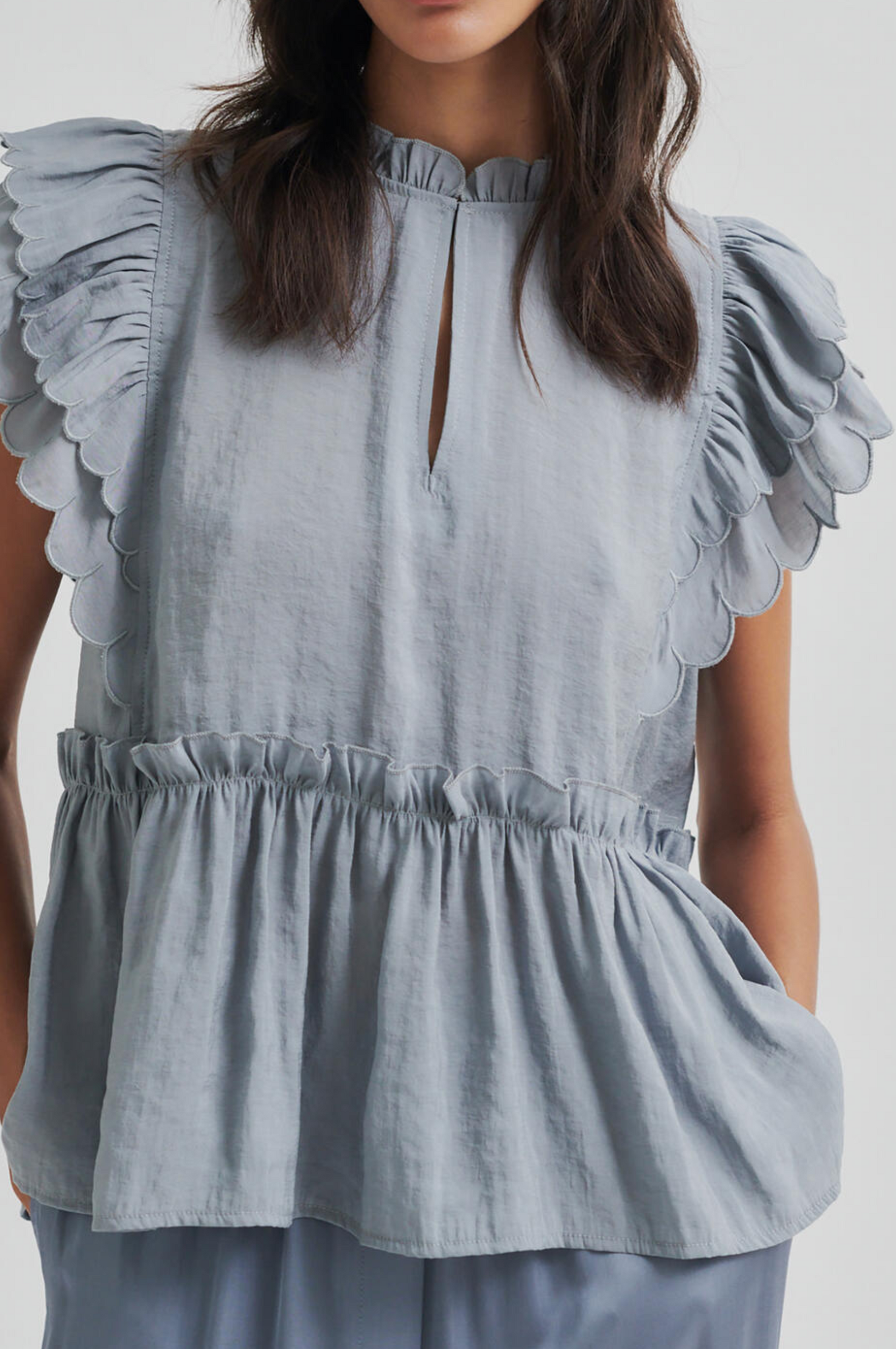 El Top con volantes de Second Female es una prenda femenina y ligera, confeccionada en una mezcla suave de modal. Su diseño presenta un escote en V y delicados detalles de volantes en el cuello, los hombros y la cintura. La capa extra en la cintura añade volumen y movimiento, mientras que su fit relajado lo convierte en una pieza cómoda y versátil para el día a día o para un look más arreglado.