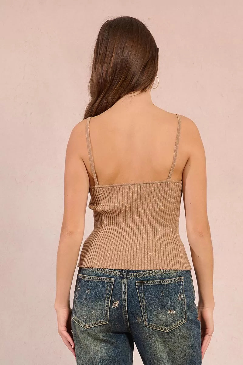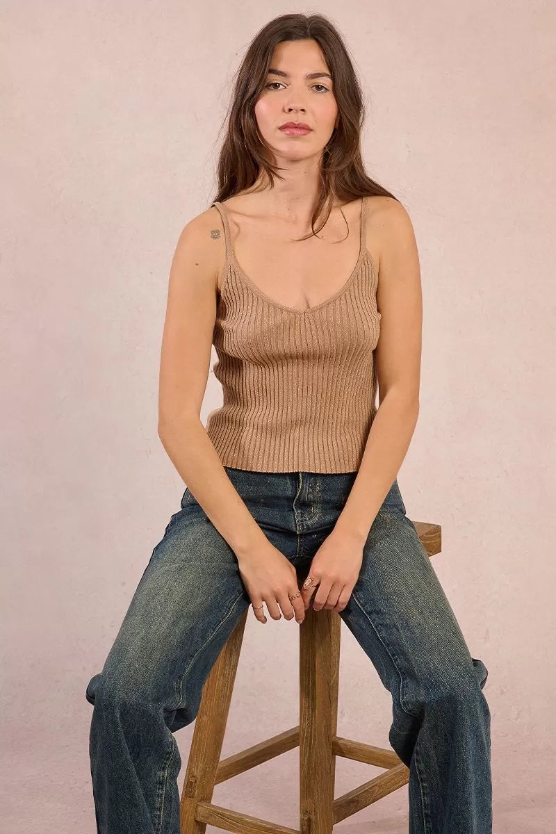 Top de tirantes en punto brillante, corte ajustado, textura acanalada y acabado con brillo sutil. Disponible en talla XS, S y M.